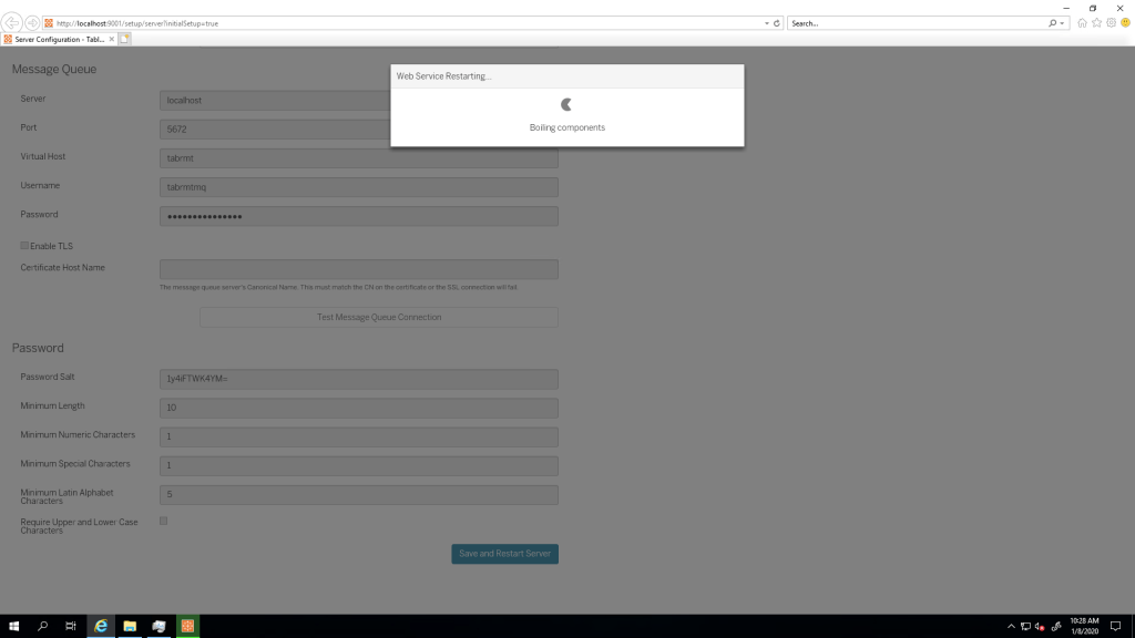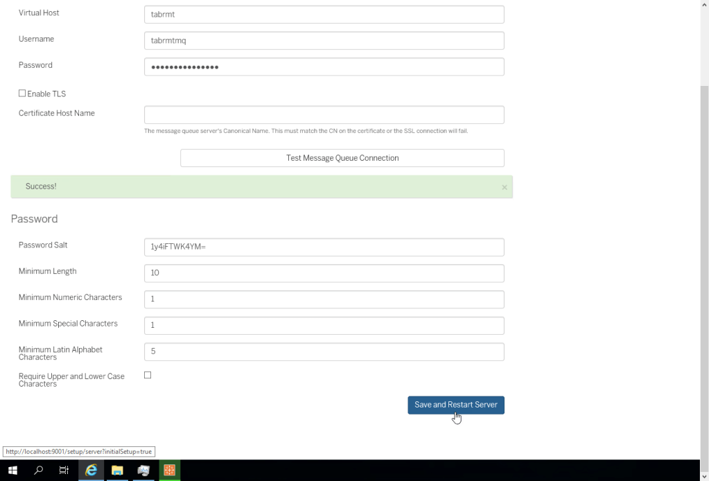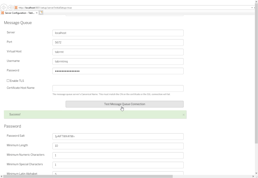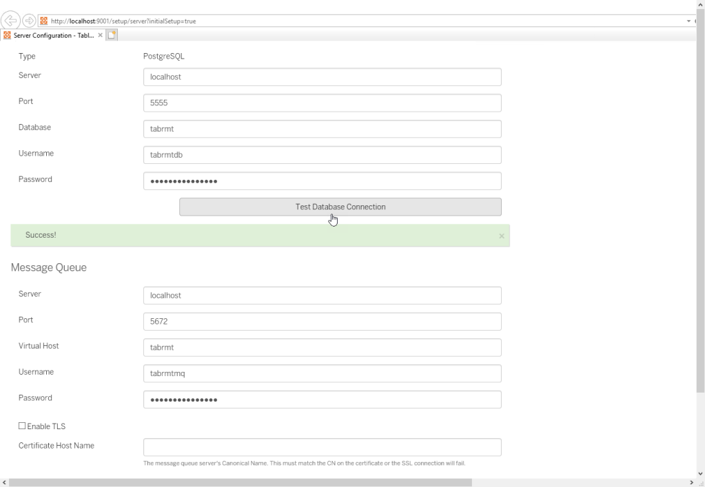 If you get Success! message then continue to click “Test Database Connection” and “Test Message Queue Connection” button.