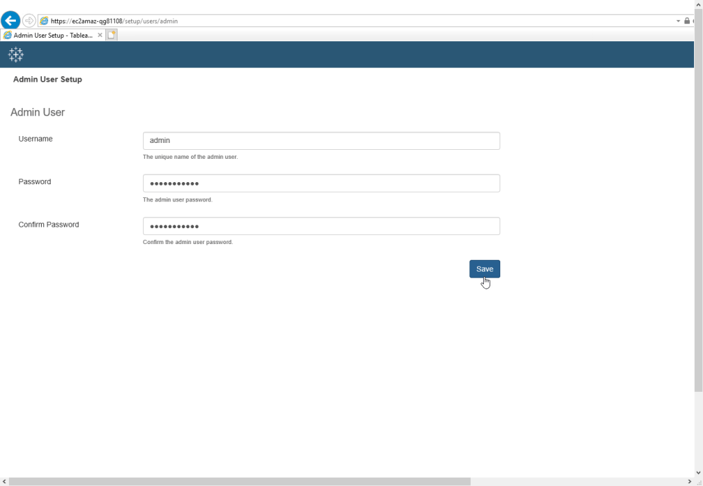 From the above browser, you can create the Admin User by entering the username and password and click “Save”.