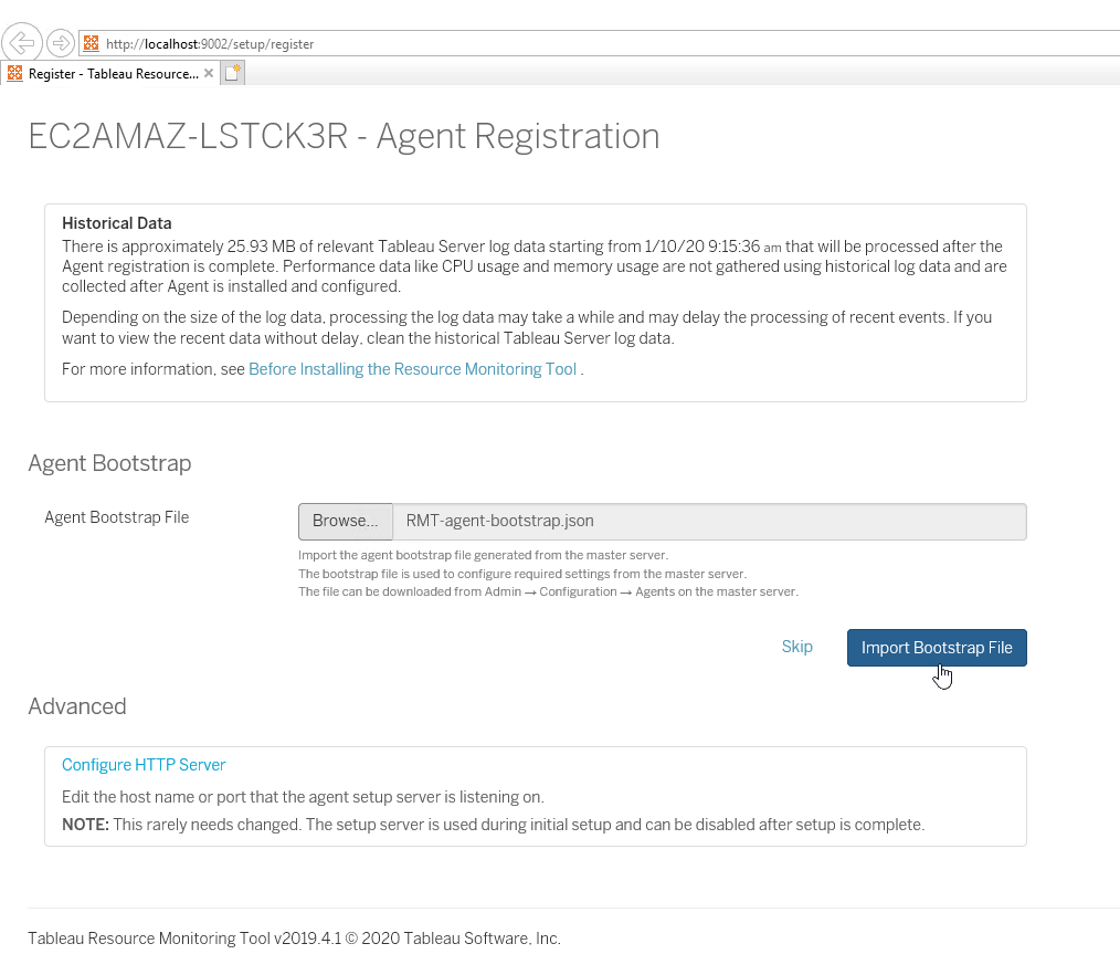 Click Browse and choose the Agent Bootstrap Configuration file you copied to this server previously (RMT-agent-bootstrap.json) and click “Import Bootstrap File” button.
