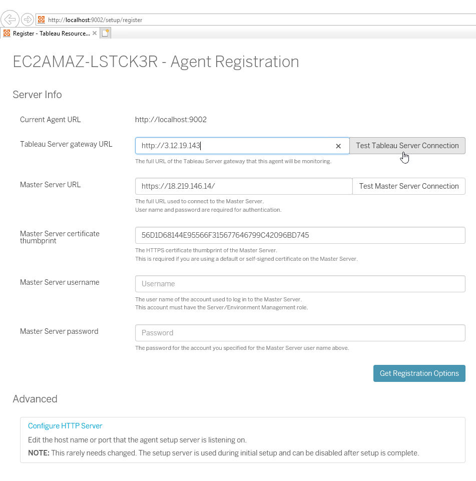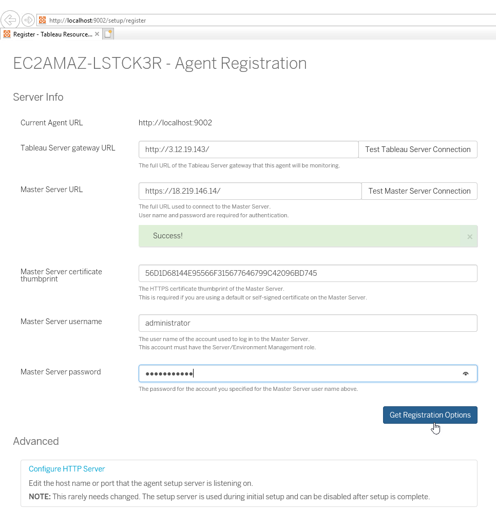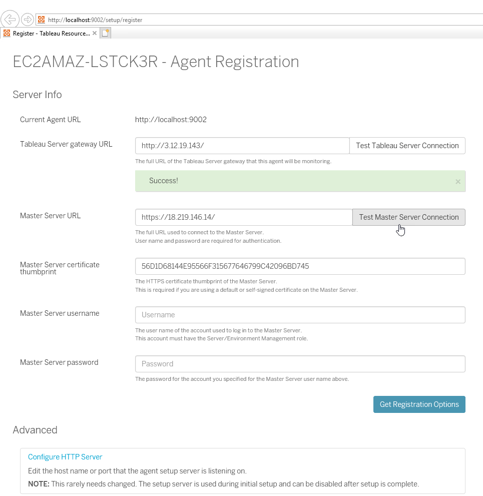 When successful, enter the Master Server username & Master Server password and click “Get Registration Options” button.