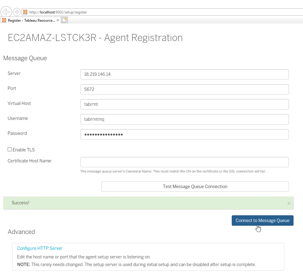 You will continue to the next webpage with some information already filled in. You have option to Enable TLS and input the Certificate Host Name. I don’t need both of them so i just click “Test Message Queue Connection” button.