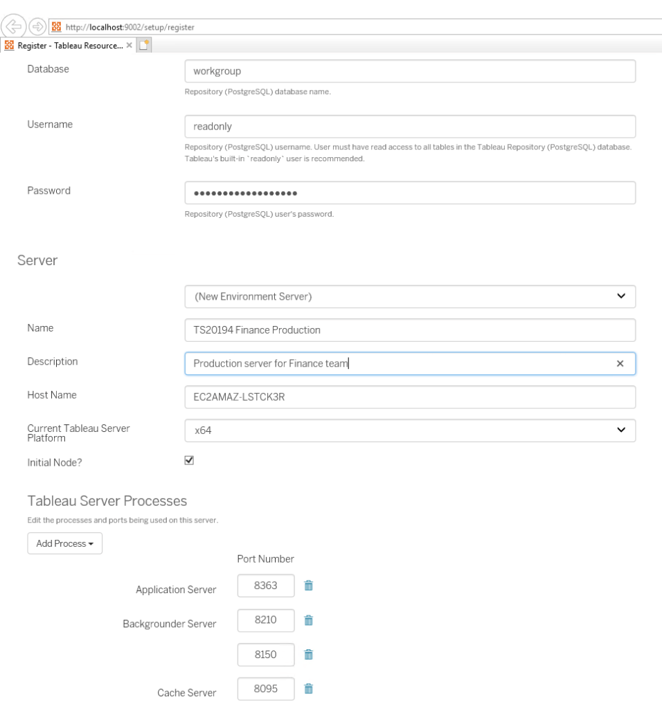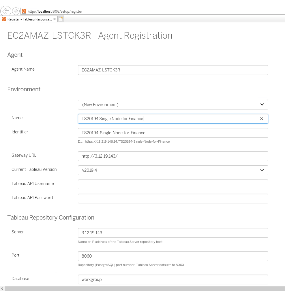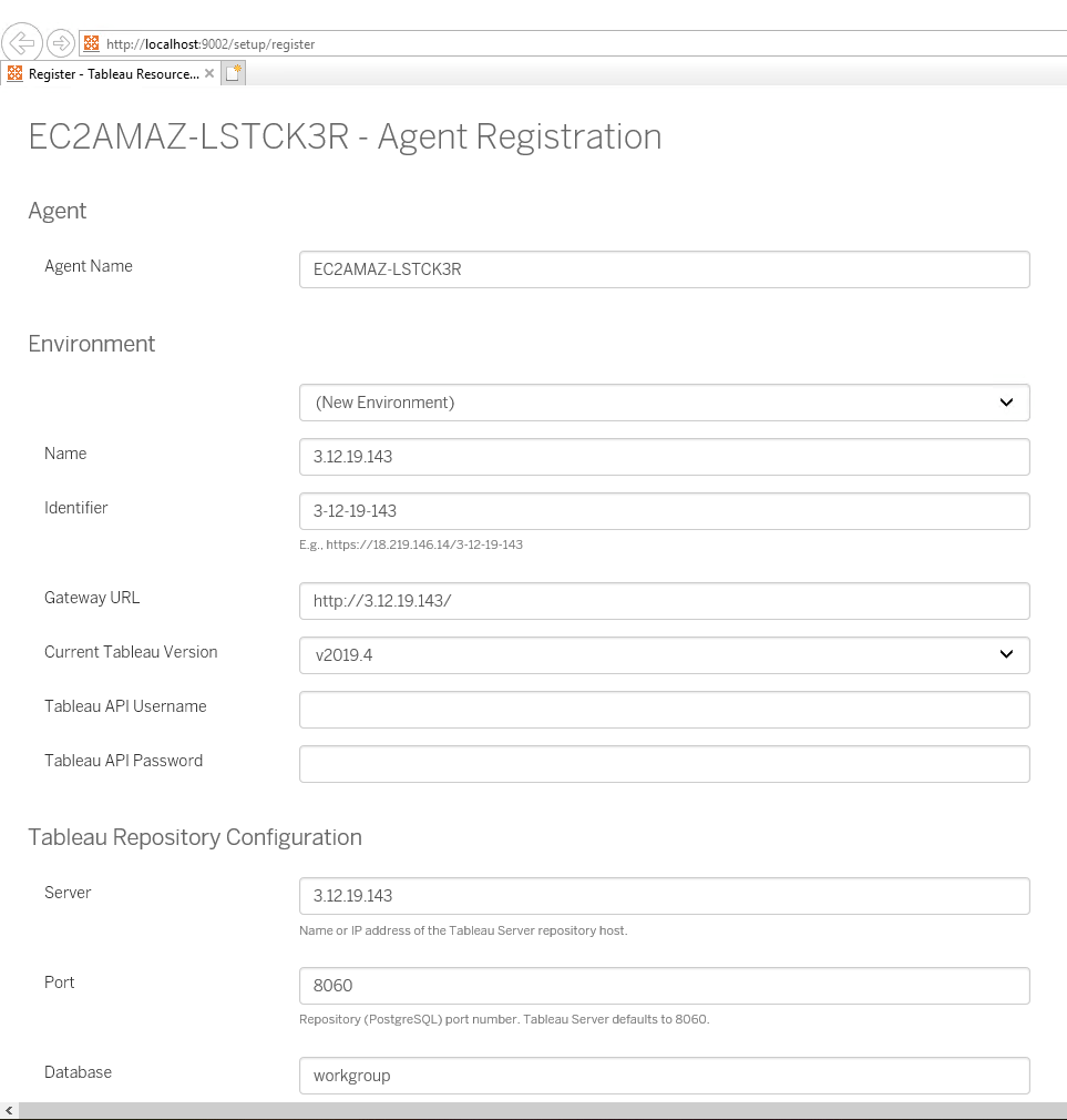 At the Tableau Repository Configuration section, enter Tableau Repository Username (readonly) & Password (the password you chose when enabling access to Tableau Repository) so RMT Agent can access tableau server repository data. And i also changed the Description.